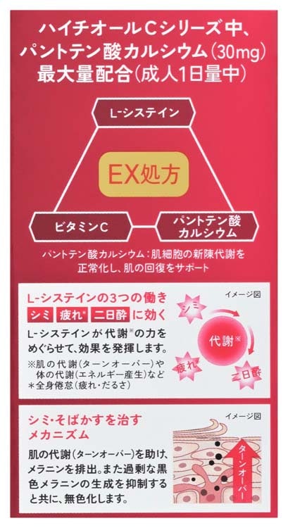 ●ハイチオールCプラスEXは、体の代謝を助けるアミノ酸「L-システイン」が体の内側から細胞に働きかけ、シミ・そばかすを治療する医薬品です。