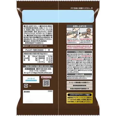 | 果糖ぶどう糖液(国内製造)、砂糖、コーヒーエキス、蒟蒻粉、食塩/加工デンプン、ゲル化剤(増粘多糖類)、香料、塩化カリウム、甘味料(アセスルファムK、スクラロース)、リン酸カリウム |