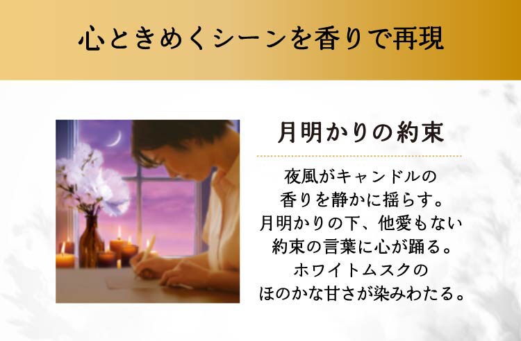 ●心ときめくシーンを香りで再現 月明かりの約束:夜風がキャンドルの香りを静かに揺らす。月明かりの下、他愛もない約束の言葉に心が躍る。ホワイトムスクのほのかな甘さが染みわたる。