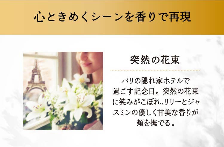 ★突然の花束:パリの隠れ家ホテルで過ごす記念日。突然の花束に笑みがこぼれ、リリーとジャスミンの優しく甘美な香りが頬を撫でる。