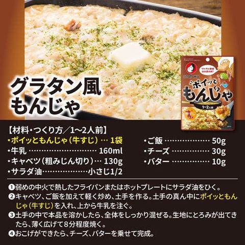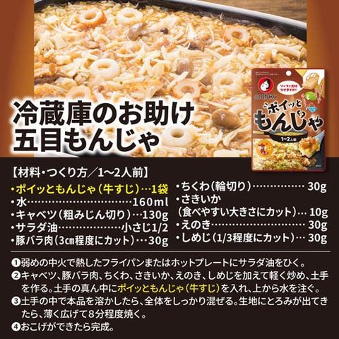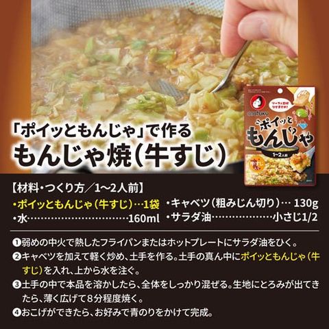 ●キャベツと水を加えて焼くだけで、もんじゃ焼が楽しめる商品です。