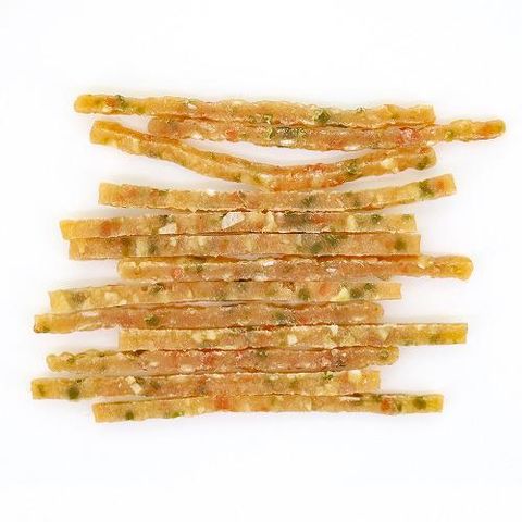 ●ササミ生地にコラーゲン粒、にんじん・ほうれん草入りの野菜粒を配合。