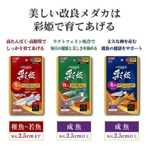 ●メダカ元気 彩姫は、養殖飼料技術に加え、ジェックスの精選された昆虫原料を配合した高栄養ハイブリッド型プレミアムフードなので、嗜好性抜群!