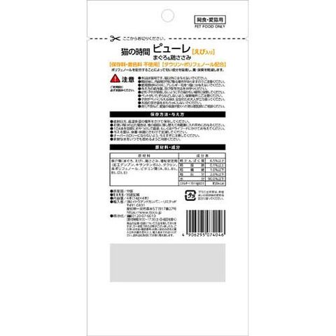 | 魚介類(まぐろ、えび)、鶏ささみ、増粘安定剤(加工デンプン、キサンタンガム)、タウリン、茶ポリフェノール、ビタミン類(A、B2、B3、B5、D3、E) |