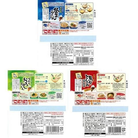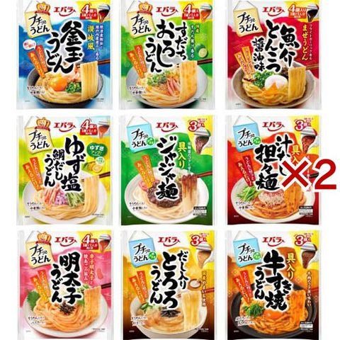 | プチッとうどん 釜玉うどん/(23g×4個)×1袋、プチッとうどん すだちおろしうどん/(22g×4個)×1袋、プチッとうどん 魚介とんこつ醤油味/(22g×4個)×1袋、プチッとうどん 明太子うどん/ (22g×4個)×1袋、プチッとうどん ゆず塩鯛だしうどん/(22g×4個)×1袋、プチッとうどんプラス具入り汁なし担々麺/(40g×3個)×1袋、プチッとうどんプラス 具入りジャージャー麺/(40g×3個)×1袋、プチッとうどんプラス だし入りとろろうどん/(42g×3個)×1袋、プチッとうどん 具入り牛すき焼うどん/(42g×3個)×1袋 計9種9袋 |