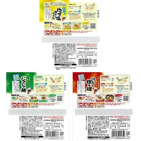 | ★プチッとうどん 釜玉うどん:小麦、さば、大豆 ★プチッとうどん すだちおろしうどん:小麦、大豆、りんご ★プチッとうどん 魚介とんこつ醤油味:小麦、大豆、豚肉 ★プチッとうどん 明太子うどん: 小麦、さけ、大豆、魚醤(魚介類) ★プチッとうどん ゆず塩鯛だしうどん:小麦、大豆、鶏肉 ★プチッとうどんプラス具入り汁なし担々麺:小麦、落花生、アーモンド、ごま、大豆、豚肉、りんご ★プチッとうどんプラス 具入りジャージャー麺:小麦、ごま、大豆、豚肉、りんご ★プチッとうどんプラス だし入りとろろうどん:小麦、大豆、やまいも ★プチッとうどん 具入り牛すき焼うどん:小麦、牛肉、大豆 |