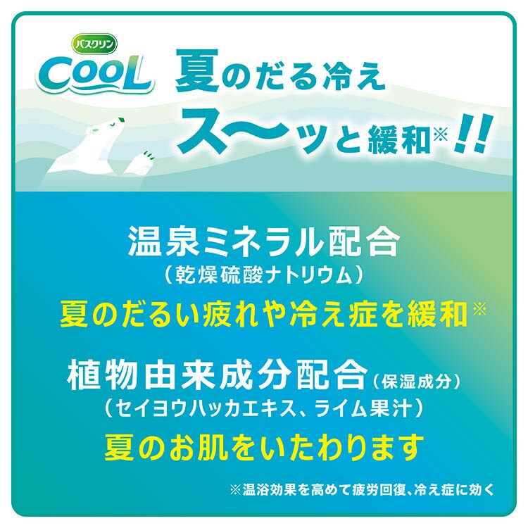 ・温泉ミネラル(乾燥硫酸ナトリウム)配合。温浴効果を高めて、血行を促進、夏のだるい疲れや冷え症を緩和