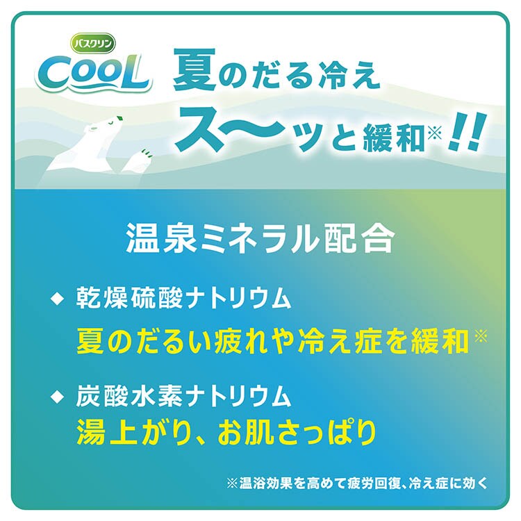 ・温泉ミネラル(乾燥硫酸ナトリウム)配合。温浴効果を高めて、血行を促進、夏のだるい疲れや冷え症を緩和