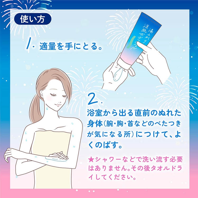 ・適量を手にとり、浴室から出る直前のぬれた身体(腕・胸・首などのべたつきが気になる所)につけて、よくのばしてください。