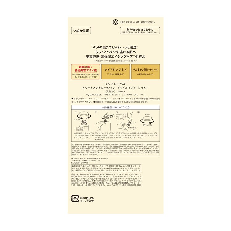 ・トリートメントローション (オイルイン) しっとり (つめかえ用)は、必ず、アクアレーベル トリートメントローション (オイルイン) しっとり の本体容器につめかえてから、ご使用ください。
