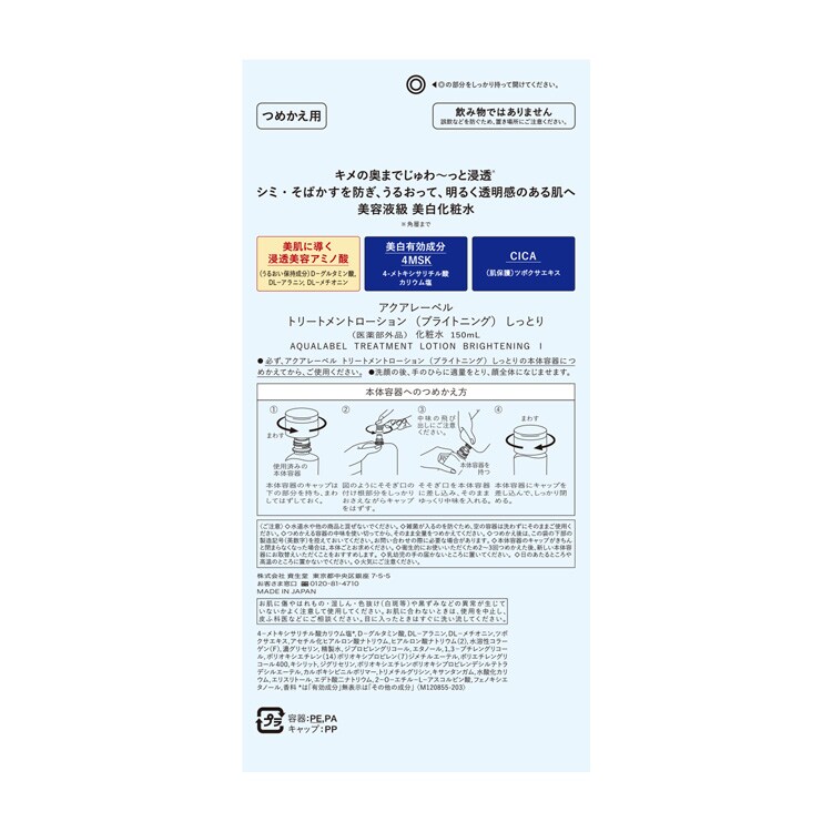 ・トリートメントローション (ブライトニング) しっとり (つめかえ用)は、必ず、アクアレーベル トリートメントローション (ブライトニング) しっとり の本体容器につめかえてから、ご使用ください。