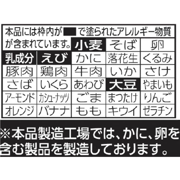 | (1食(68g)当たり) エネルギー:306kcal、たんぱく質:5.9g、脂質:13.5g、炭水化物:40.2g、食塩相当量:4.4g |