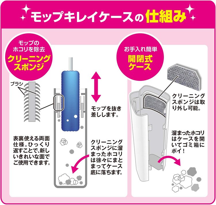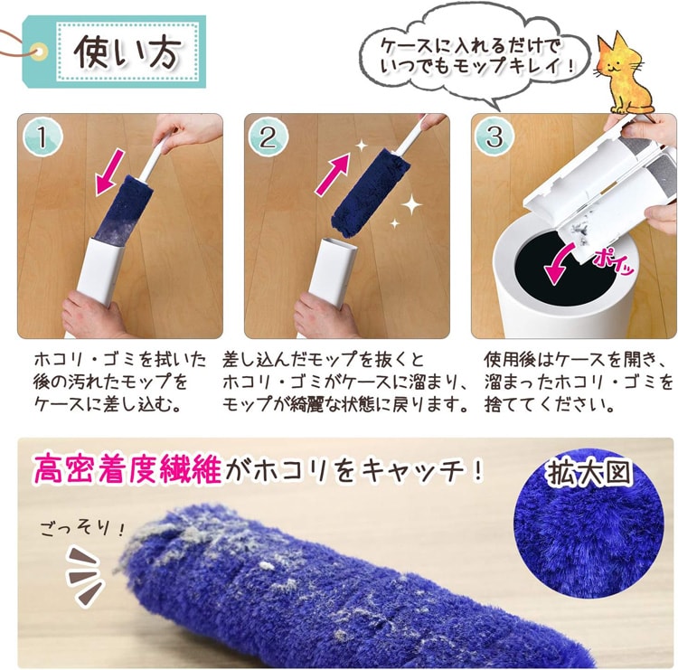 (2)差し込んだモップを抜き取ることで、ホコリ・ごみはケースに溜まり、モップはキレイな状態に戻ります。