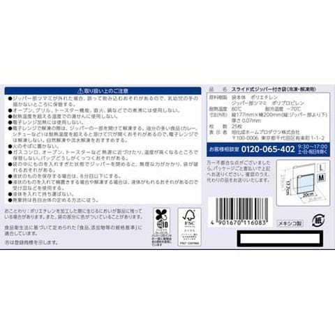 | 材質/袋本体:ポリエチレン ジッパー部ツマミ:ポリプロピレン 商品サイズ:縦177mm×横200mm(縦:ジッパー部より下) 厚さ:0.07mm 耐熱温度:80度 耐冷温度:-70度 |