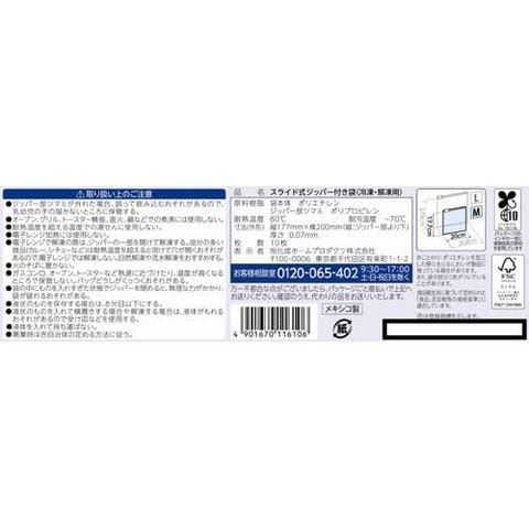 | 材質/袋本体:ポリエチレン ジッパー部ツマミ:ポリプロピレン 商品サイズ:縦177mm×横200mm(縦:ジッパー部より下) 厚さ:0.07mm 耐熱温度:80度 耐冷温度:-70度 |