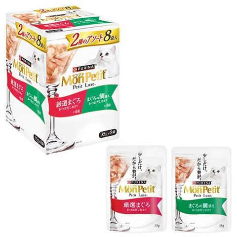 【モンプチ プチリュクスパウチ 2種のアソート 厳選まぐろ&まぐろの鯛添えの商品詳細】