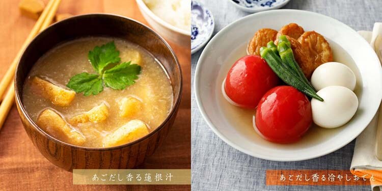 ●あご(とびうお)やかつおがベースのやさしい味わいの顆粒だしです。