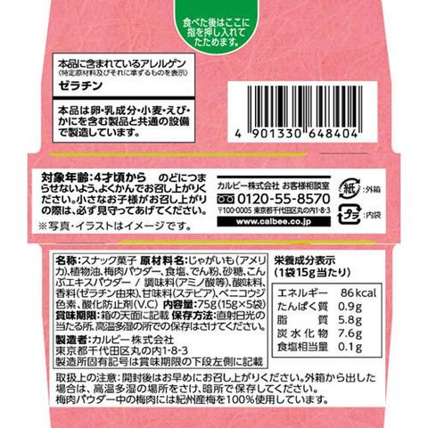 | じゃがいも(アメリカ)、植物油、梅肉パウダー、食塩、でん粉、砂糖、こんぶエキスパウダー/調味料(アミノ酸等)、酸味料、香料(ゼラチン由来)、甘味料(ステビア)、ベニコウジ色素、酸化防止剤(V.C) |