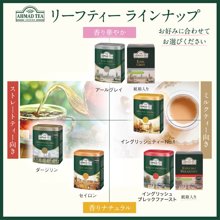 ●英国紅茶ブランドAHMAD TEA(アーマッドティー)が贈る、おうちでカフェ気分を楽しめる本格リーフティー(茶葉タイプ)。