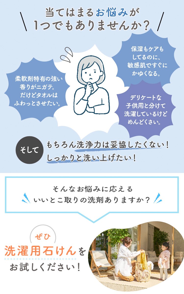 ●純石けんタイプなので、日々の洗濯だけでなくデリケート資材の手洗いにもお使いいただけます。