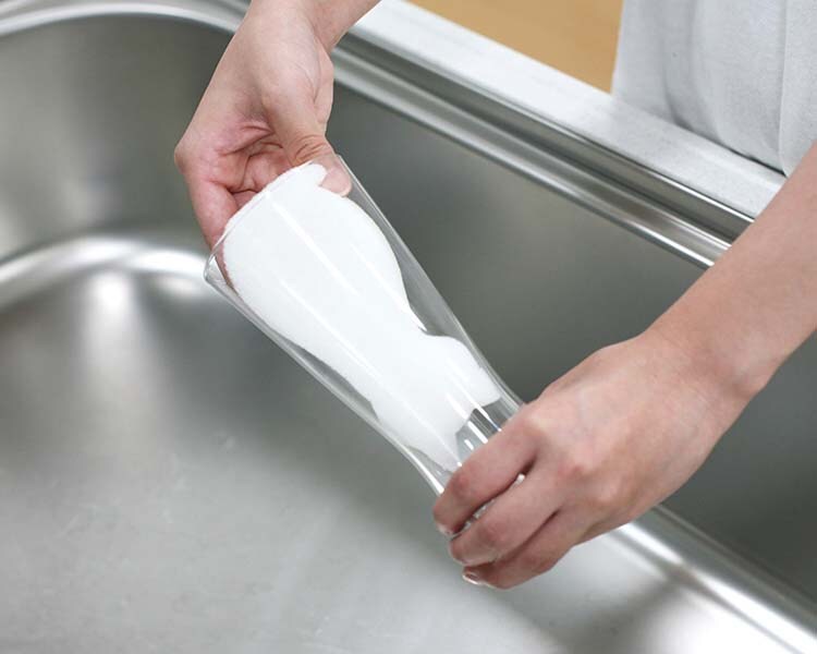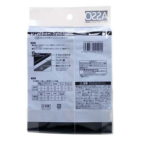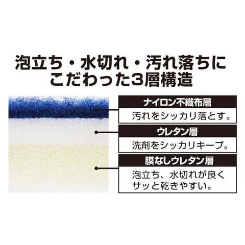 ●研磨材不使用の不織布、泡を保持する有膜スポンジ、泡立ちが早く水切れも良い脱膜スポンジを組み合わせた3層タイプ。