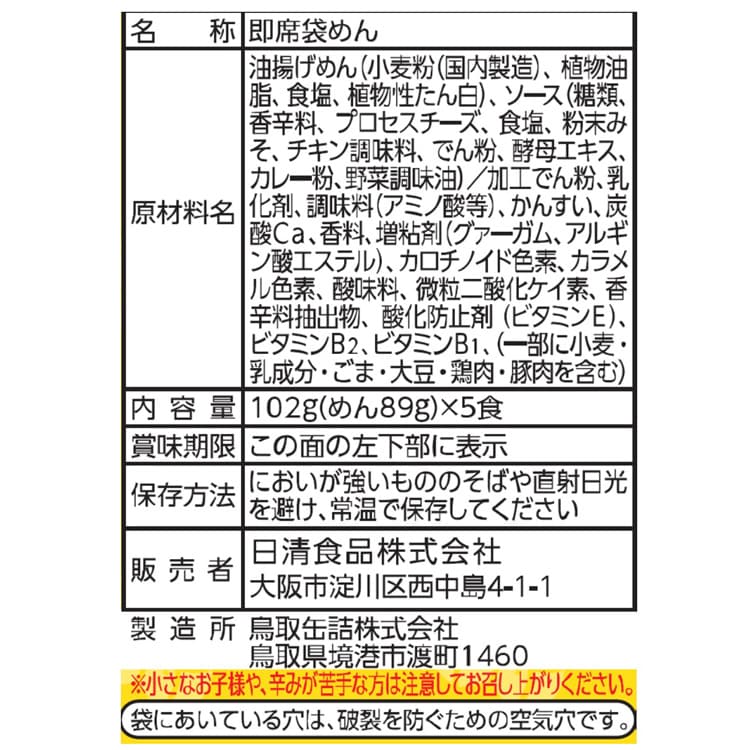 | 油揚げめん(小麦粉(国内製造)、植物油脂、食塩、植物性たん白)、ソース(糖類、香辛料、プロセスチーズ、食塩、粉末みそ、チキン調味料、でん粉、酵母エキス、カレー粉、野菜調味油)/加工でん粉、乳化剤、調味料(アミノ酸等)、かんすい、炭酸Ca、香料、増粘剤(グァーガム、アルギン酸エステル)、カロチノイド色素、カラメル色素、酸味料、微粒二酸化ケイ素、香辛料抽出物、酸化防止剤(ビタミンE)、ビタミンB2、ビタミンB1、(一部に小麦・乳成分・ごま・大豆・鶏肉・豚肉を含む) |