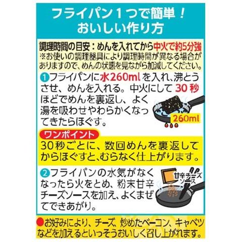 (1)フライパンに水260mlを入れ、沸とうさせ、めんを入れる。中火にして30秒ほどでめんを裏返し、よく湯を吸わせやわらかくなってきたらほぐす。※ワンポイント:30秒ごとに、数回めんを裏返してからほぐすと、むらなく仕上がります。