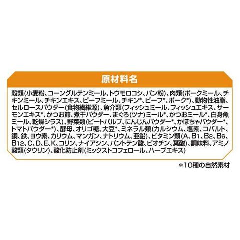 | 穀類(小麦粉、コーングルテンミール、トウモロコシ、パン粉)、肉類(ポークミール、チキンミール、チキンエキス、ビーフミール、チキン*、ビーフ*、ポーク*)、動物性油脂、セルロースパウダー(食物繊維源)、魚介類(フィッシュミール、フィッシュエキス、サーモンエキス*、かつお節、煮干パウダー、まぐろ(ツナ)ミール*、かつおミール*、白身魚ミール、乾燥シラス)、野菜類(ビートパルプ、にんじんパウダー*、かぼちゃパウダー*、トマトパウダー*)、酵母、オリゴ糖、大豆*、ミネラル類(カルシウム、塩素、コバルト、銅、鉄、ヨウ素、カリウム、マンガン、ナトリウム、亜鉛)、ビタミン類(A、B1、B2、B6、B12、C、D、E、K、コリン、ナイアシン、パントテン酸、ビオチン、葉酸)、調味料、アミノ酸類(タウリン)、酸化防止剤(ミックストコフェロール、ハーブエキス)*10種の自然素材 |