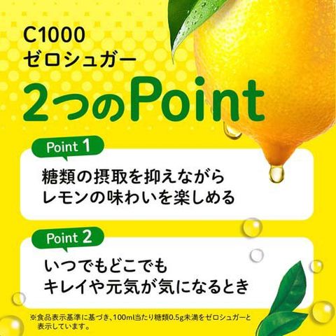 ●レモン50個分(果汁換算)のビタミンC1000mgを手軽に補給できる、レモン風味のゼロシュガー炭酸飲料なので、砂糖の摂取を抑えながらレモンの味わいを楽しむことができ、ビタミンC補給でキレイと元気をサポートします。