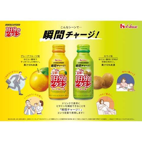 | 1本(120ml)当たり エネルギー:56kcal、たんぱく質:0g、脂質:0g、炭水化物:14g、食塩相当量:0.16g、ビタミンA:770μg ビタミンB1:1.2mg、ビタミンB2 1.4mg、ビタミンB6 1.3mg、ビタミンB12 2.4-6.8μg、ビタミンC 100-230mg、ビタミンD 5.5μg、ビタミンE :6.3mg、ビタミンK:150μg、ナイアシン:13mg、パントテン酸:4.8-20.0mg、葉酸:240-860μg、ビオチン:50μg |