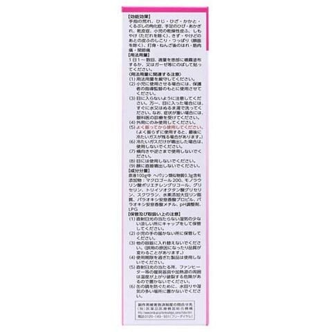 | 原液100g中 ヘパリン類似物質:0.3g含有 添加物:マクロゴール200、モノラウリン酸ポリエチレングリコール、グリセリン、トリイソオクタン酸グリセリン、スクワラン、水素添加大豆リン脂質、パラオキシ安息香酸プロピル、パラオキシ安息香酸メチル、pH調整剤、LPG |