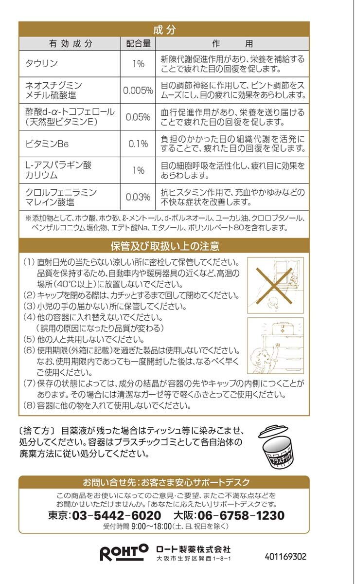 | [有効成分:配合量:作用] タウリン:1%:新陳代謝促進作用があり、栄養を補給することで疲れた目の回復を促します。 ネオスチグミンメチル硫酸塩:0.005%:目の調節神経に作用して、ピント調節をスムーズにし、目の疲れに効果をあらわします。 酢酸d-α-トコフェロール(天然型ビタミンE):0.05%:血行促進作用があり、栄養を送り届けることで疲れた目の回復を促します。 ビタミンB6:0.1%:負担のかかった目の組織代謝を活発にすることで、疲れた目の回復を促します。 L-アスパラギン酸カリウム:1%:目の細胞呼吸を活性化し、疲れ目に効果をあらわします。 クロルフェニラミンマレイン酸塩:0.03%:抗ヒスタミン作用で、充血やかゆみなどの不快な症状を改善します。 ※添加物として、ホウ酸、ホウ砂、L-メントール、d-ボルネオール、ユーカリ油、クロロブタノール、ベンザルコニウム塩化物、エデト酸Na、エタノール、ポリソルベート80を含有します。 |