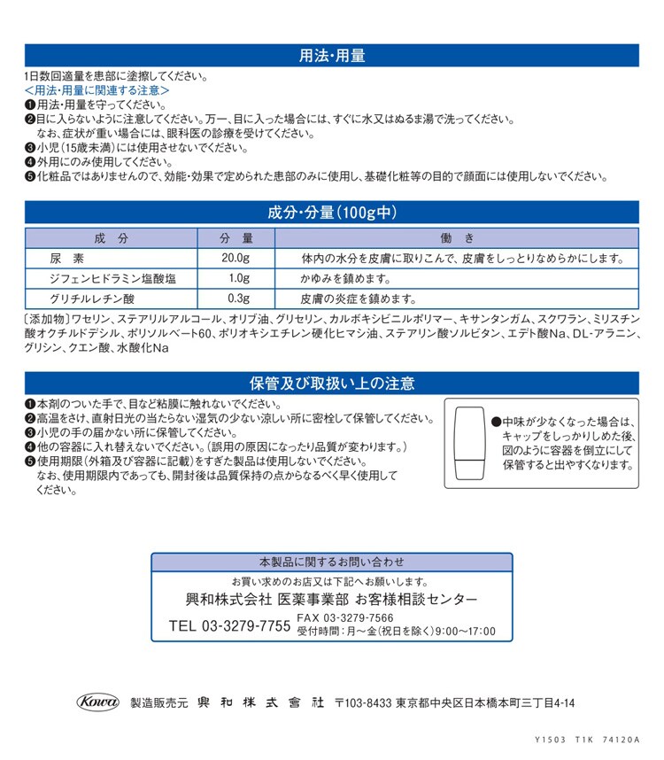 | 成分・分量(100g中) [成分:分量:働き] 尿素:20.0g:体内の水分を皮膚に取りこんで、皮膚をしっとりなめらかにします。 ジフェンヒドラミン塩酸塩:1.0g:かゆみを鎮めます。 グリチルレチン酸:0.3g:皮膚の炎症を鎮めます。 添加物:ワセリン、ステアリルアルコール、オリブ油、グリセリン、カルボキシビニルポリマー、キサンタンガム、スクワラン、ミリスチン酸オクチルドデシル、ポリソルベート60、ポリオキシエチレン硬化ヒマシ油、ステアリン酸ソルビタン、エデト酸Na、DL-アラニン、グリシン、クエン酸、水酸化Na |