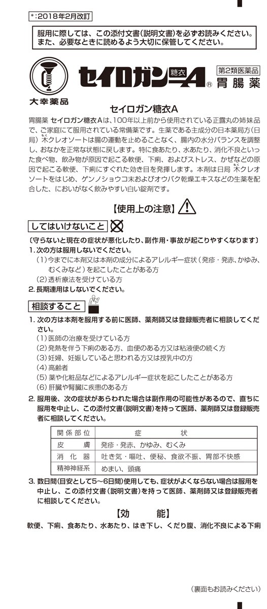 ●胃腸薬セイロガン糖衣Aは、正露丸の姉妹品で、ご家庭にて服用されている常備薬です。