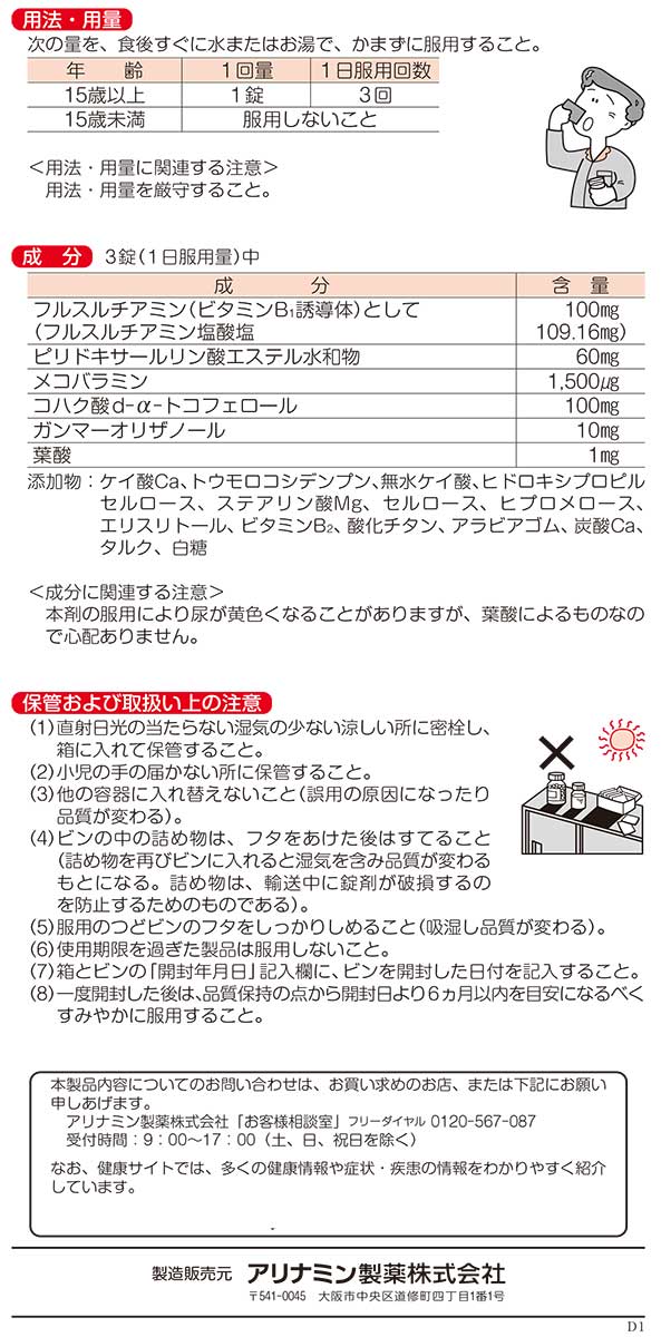 | 3錠(1日服用量)中 [成分:含量] フルスルチアミン(ビタミンB1誘導体)として:100mg (フルスルチアミン塩酸塩:109.16mg) ピリドキサールリン酸エステル水和物:60mg メコバラミン:1500μg コハク酸d-α-トコフェロール:100mg ガンマーオリザノール:10mg 葉酸:1mg 添加物:ケイ酸Ca、トウモロコシデンプン、無水ケイ酸、ヒドロキシプロピルセルロース、ステアリン酸Mg、セルロース、ヒプロメロース、エリスリトール、ビタミンB2、酸化チタン、アラビアゴム、炭酸Ca、タルク、白糖 ★成分に関連する注意 本剤の服用により尿が黄色くなることがありますが、葉酸によるものなので心配ありません。 |