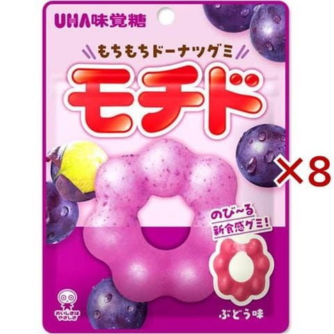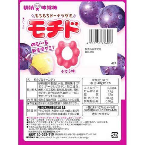 砂糖(国内製造)、水飴、濃縮果汁(ぶどう、デーツ)、ゼラチン、加工油脂、米粉/加工澱粉、乳化剤、酸味料、香料、光沢剤、着色料(赤色40号)、(一部に大豆・ゼラチンを含む)