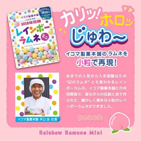 ●イコマ製菓本舗と共同開発を行い、レインボーラムネの美味しさはそのままに小粒でカラフルなカワイイラムネに仕上げました。
