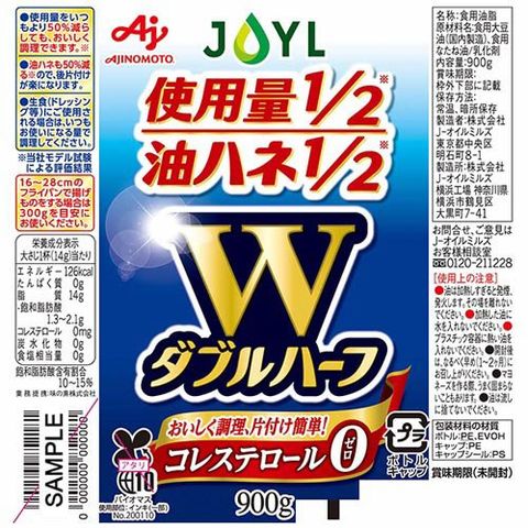 ●「JOYL ダブルハーフ」は、使用量がで少量で調理ができ、油ハネが少ないサラダ油です。