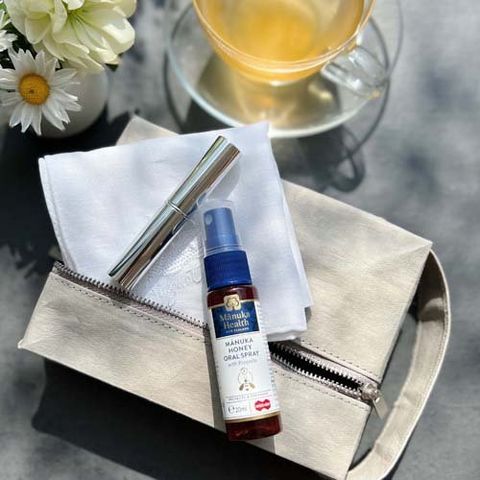●100%ニュージーランド産のプロポリスとMGO400+(UMF13+)の高グレードマヌカハニー、ペパーミントオイルなどの天然由来の香料を配合したスプレーです。