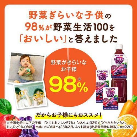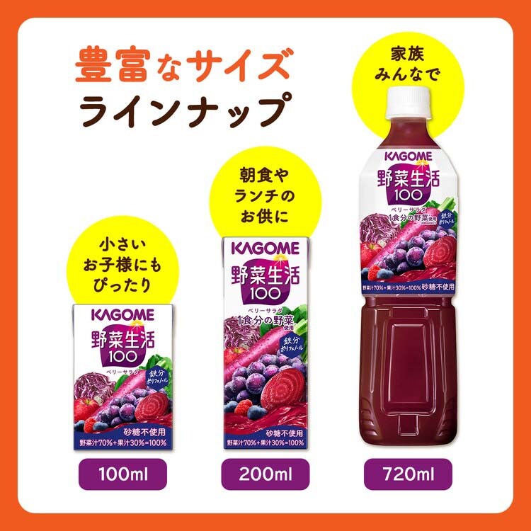 ●「野菜生活100」ベリーサラダは、紫にんじん、紫キャベツ、紫芋など紫の野菜を含む20種類の野菜と6種類の果実を使用した野菜果実ミックスジュースです。