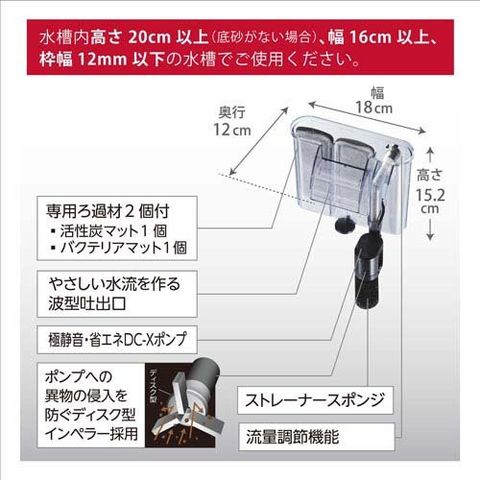 ●水槽内高さ20cm(底砂がない場合)、水槽内幅16cm以上、枠幅12cm以下の水槽でご使用ください。