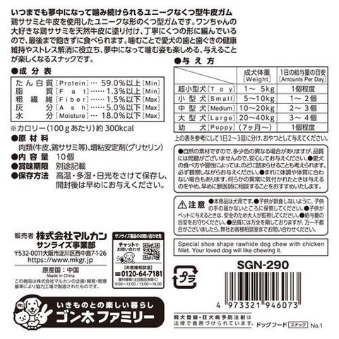 ●鶏ササミと牛皮を使用したユニークな形のシューズ型ガムです。