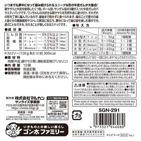 ●鶏ササミと牛皮を使用したくつ型、ボール型、サンダル型の3種が入った牛皮ガムのバラエティパックです。