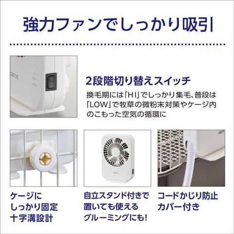 ・換毛期には「HI(強)」でしっかり集毛、普段は「LOW(弱)」で牧草の微粉末対策やケージ内のこもった空気の順かに。