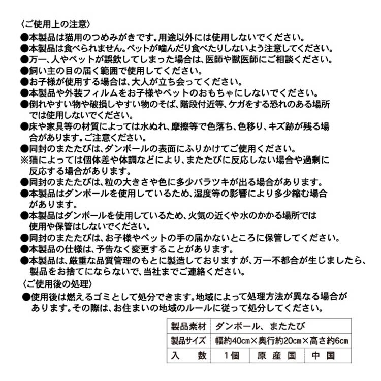 ・本製品は猫用のつめみがきです。用途以外には使用しないでください。