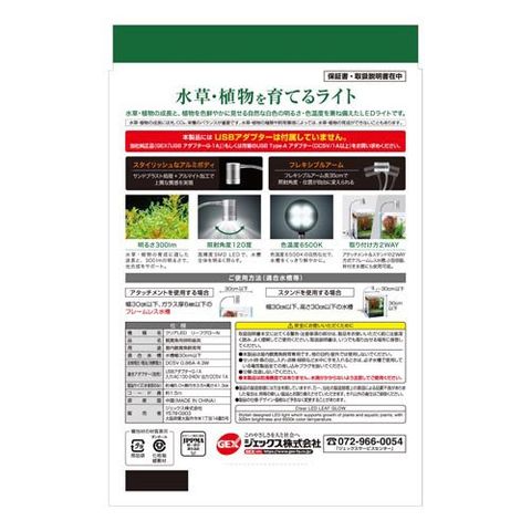 | (本体サイズ)約5×3.5×41.3cm (適合水槽)幅約30cm以下の水槽 (電源コード長)約1.5m (定格電圧/消費電力)DC5V 0.86A 4.3W※本製品にはUSBアダプターは付属していません!当社純正アダプター(USBアダプター G-1A)もしくは市販のUSBアダプター(DC5V 1A以上)をお買い求めください。 |