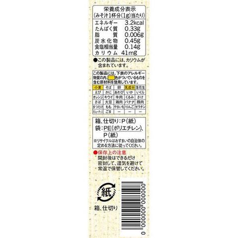 | みそ汁1杯分(1g)当たり エネルギー・・・3.2kcaL たんぱく質・・・0.33g 脂質・・・0.006g 炭水化物・・・0.45g 食塩相当量・・・0.14g カリウム・・・41mg |