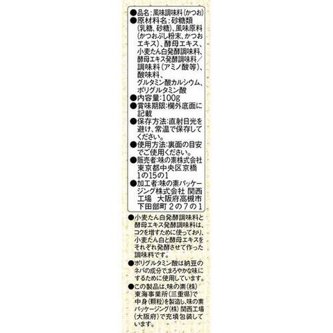 | 砂糖類(乳糖、砂糖)、風味原料(かつおぶし粉末、かつおエキス)、食塩、酵母エキス、小麦たん白発酵調味料/調味料(アミノ酸等)、酸味料、ポリグルタミン酸 |