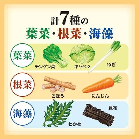 ●この1杯で、チンゲン菜・ごぼう・わかめなど計7種の葉物野菜・根菜・海藻が摂れる、具だくさんスープです。