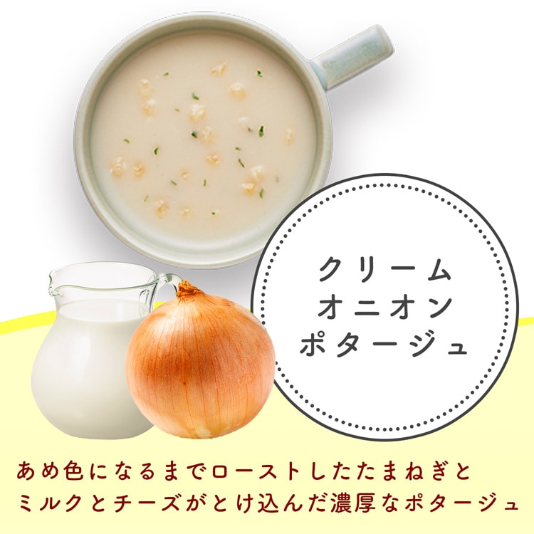 ●あめ色になるまでローストしたたまねぎを使ったコクのあるスープに、ミルクとチーズがとけ込んだ、まろやかで濃厚なおいしさのポタージュです。